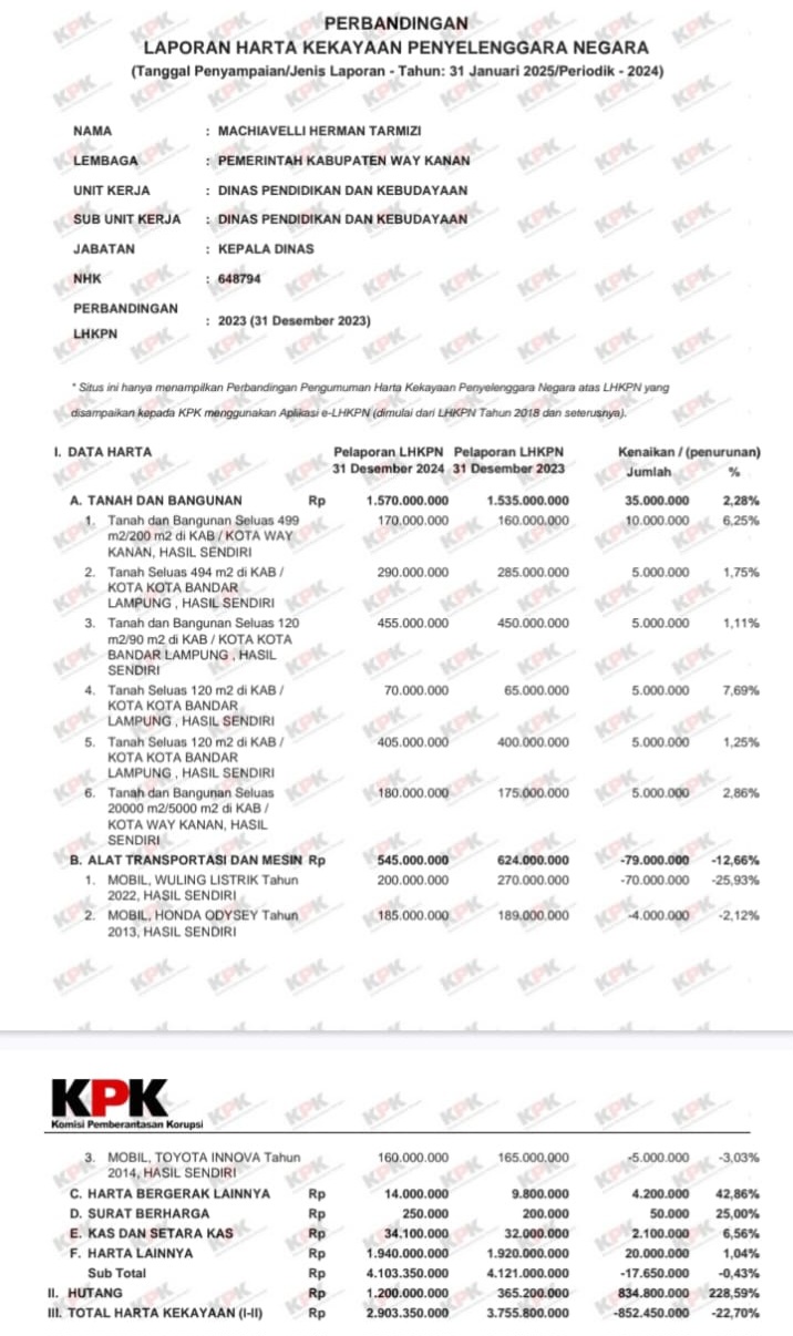 AKARPOST.COM Sekretaris Daerah (Sekda) Kabupaten Waykanan, Machiavelli Herman Tarmizi, kembali menjadi sorotan publik setelah ditemukan sejumlah kejanggalan dalam Laporan Harta Kekayaan Penyelenggara Negara (LHKPN) dan pelaksanaan sejumlah proyek Dinas Pendidikan (Disdik) Waykanan tahun 2024. Temuan ini mengindikasikan lemahnya pengawasan dan ketidaksesuaian dalam pelaksanaan kegiatan, 21 November 2025.