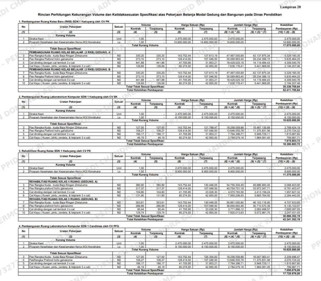 · Yang lebih parah, audit atas 55 paket pembangunan gedung menemukan kekurangan volume Rp655,4 juta dan ketidaksesuaian spesifikasi Rp971,1 juta. Total potensi kerugian dari 55 paket ini saja menyentuh Rp1,626 miliar. Item seperti K3, folding gate, dan pengecatan kerap dikerjakan asal-asalan atau dikurangi.