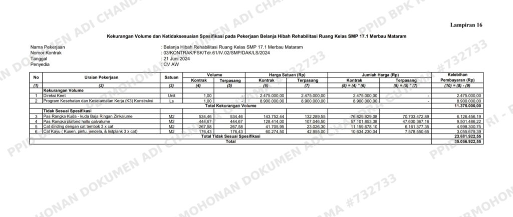 · Pada rehabilitasi ruang kelas SMP 17.1 Merbau Mataram, ditemukan kekurangan volume dan ketidaksesuaian spesifikasi senilai Rp35.056.922,55. Pekerjaan seperti rangka atap baja ringan, plafond, dan pengecatan tidak sesuai kontrak.