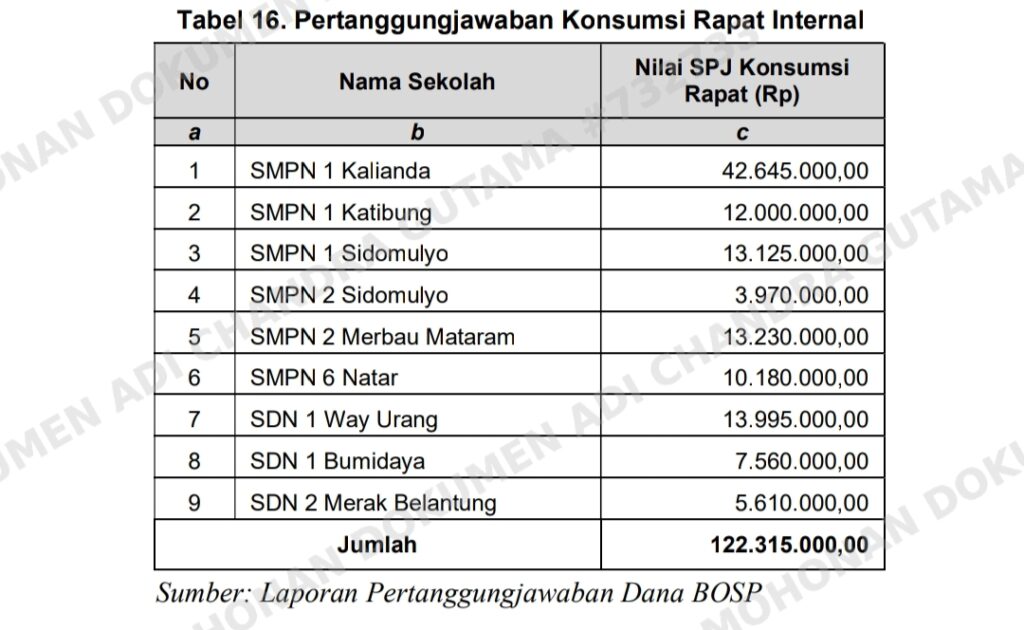 · Sebanyak 9 sekolah juga kedapatan menggunakan dana BOSP untuk konsumsi rapat internal guru dan staf tanpa melibatkan pihak eksternal, melanggar Perpres No. 33/2020.