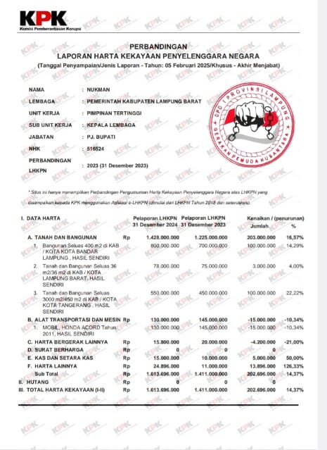 Berdasarkan data e-LHKPN KPK, total harta kekayaan Nukman melonjak dari Rp1,411 miliar (2023) menjadi Rp1,613 miliar (akhir menjabat per 31 Desember 2024). Kenaikan sebesar Rp202.696.000 ini dinilai tidak wajar mengingat statusnya sebagai PJ Bupati yang masa tugasnya terbatas.