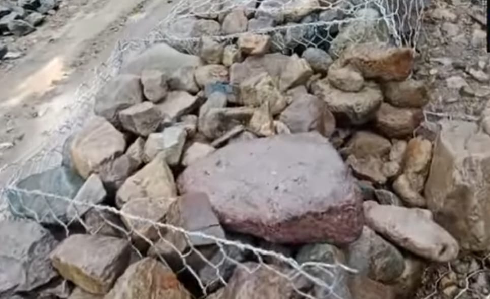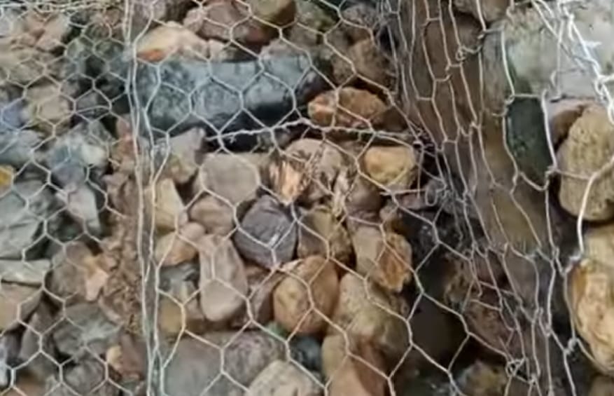 - Kawat beronjong yang digunakan diduga tidak memenuhi standar SNI, terlihat dari anyaman kawat yang mudah melebar. Kondisi ini berpotensi menyebabkan batu keluar dan tergerus arus air, terutama karena isian batu bagian tengah berukuran kecil.