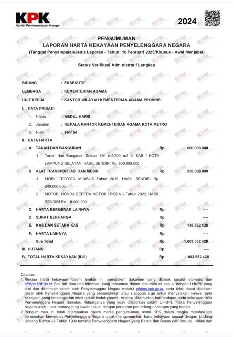 METRO – Lembaga Swadaya Masyarakat (LSM) JATI Provinsi Lampung menyoroti Laporan Harta Kekayaan Penyelenggara Negara (LHKPN) Kepala Kantor Kementerian Agama (Kemenag) Kota Metro, Abdul Haris. Diduga dalam laporan yang disampaikan, yang bersangkutan tidak mencantumkan seluruh harta kekayaannya secara transparan.