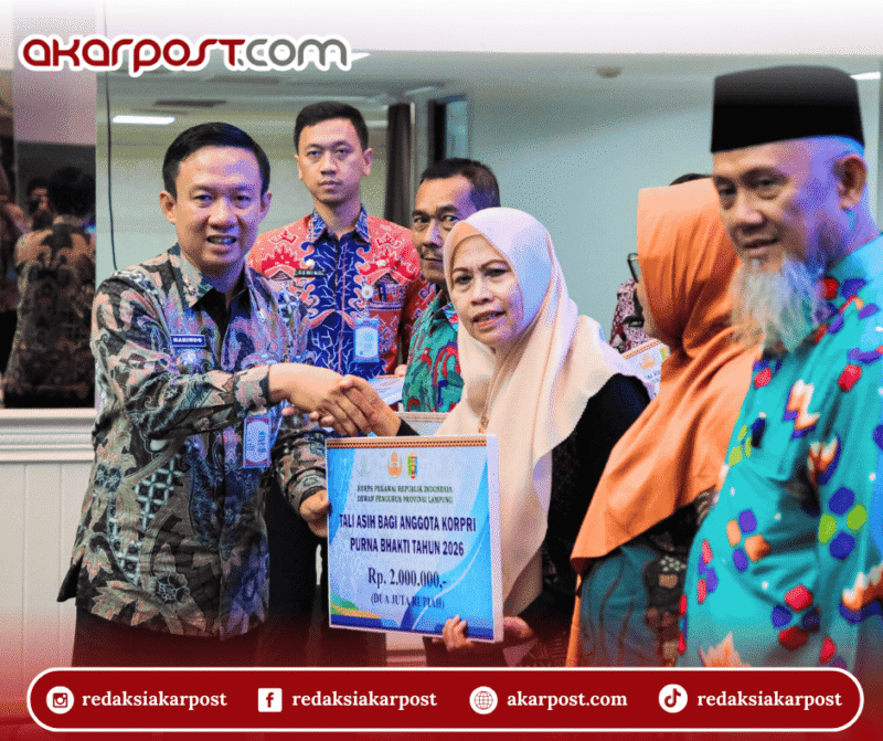 BANDARLAMPUNG — Pemerintah Provinsi Lampung menyerahkan tali asih, santunan dan penghargaan kepada anggota Korps Pegawai Republik Indonesia (Korpri) di Lingkungan Pemprov Lampung di Gedung Balai Keratun, Kantor Gubernur Lampung, Bandarlampung, Jumat (2/1/2026).